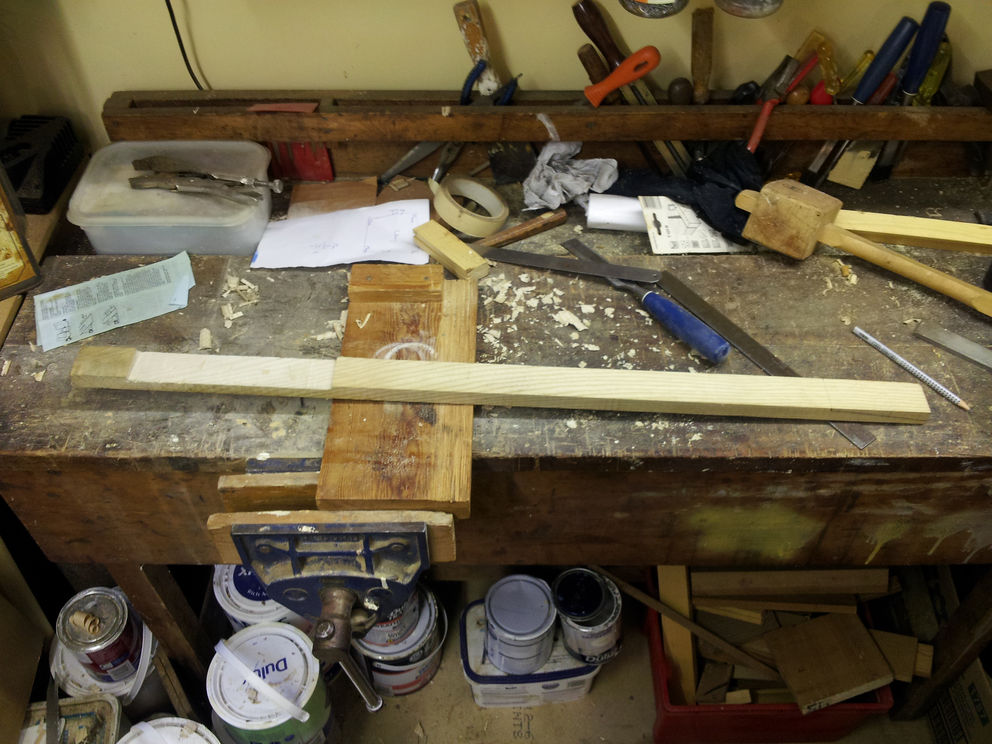 The 2×1 maple neck with the lid-notch chiseled out. That took AGES.